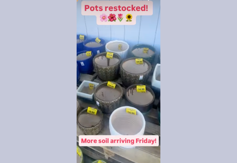 Pots are restocked! Get geared to go for Spring! More soil will be arriving this Friday for some perfect planting!