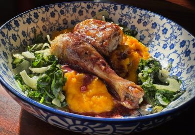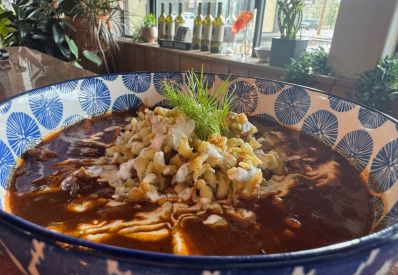 Grilled chicken breast, spicy mole, black bean salsa, lime crème, cotija, and pickled onions — all wrapped in warm naan. 🫓